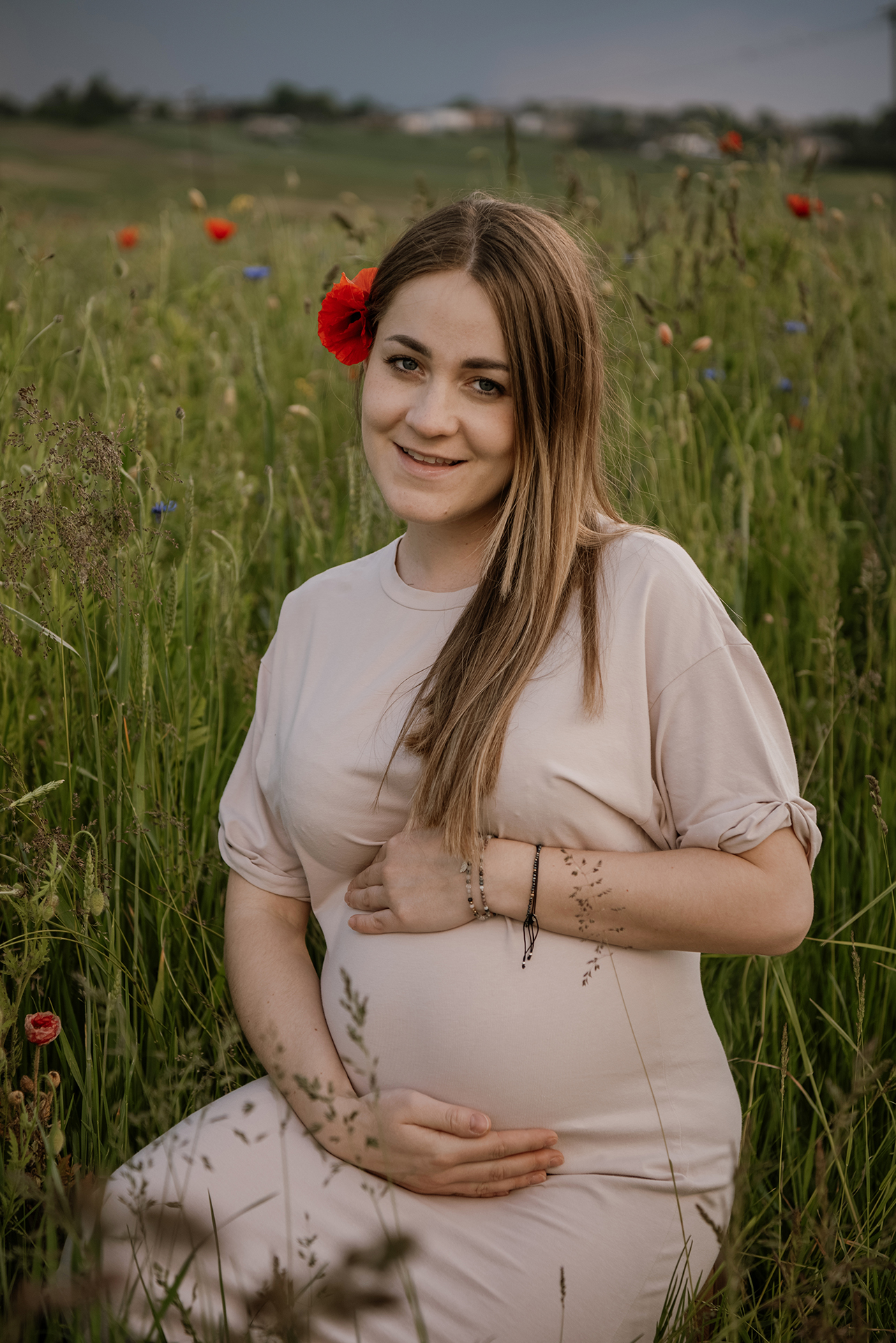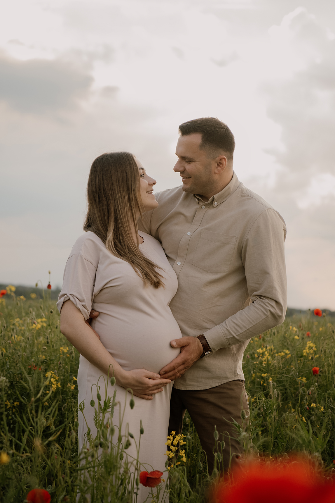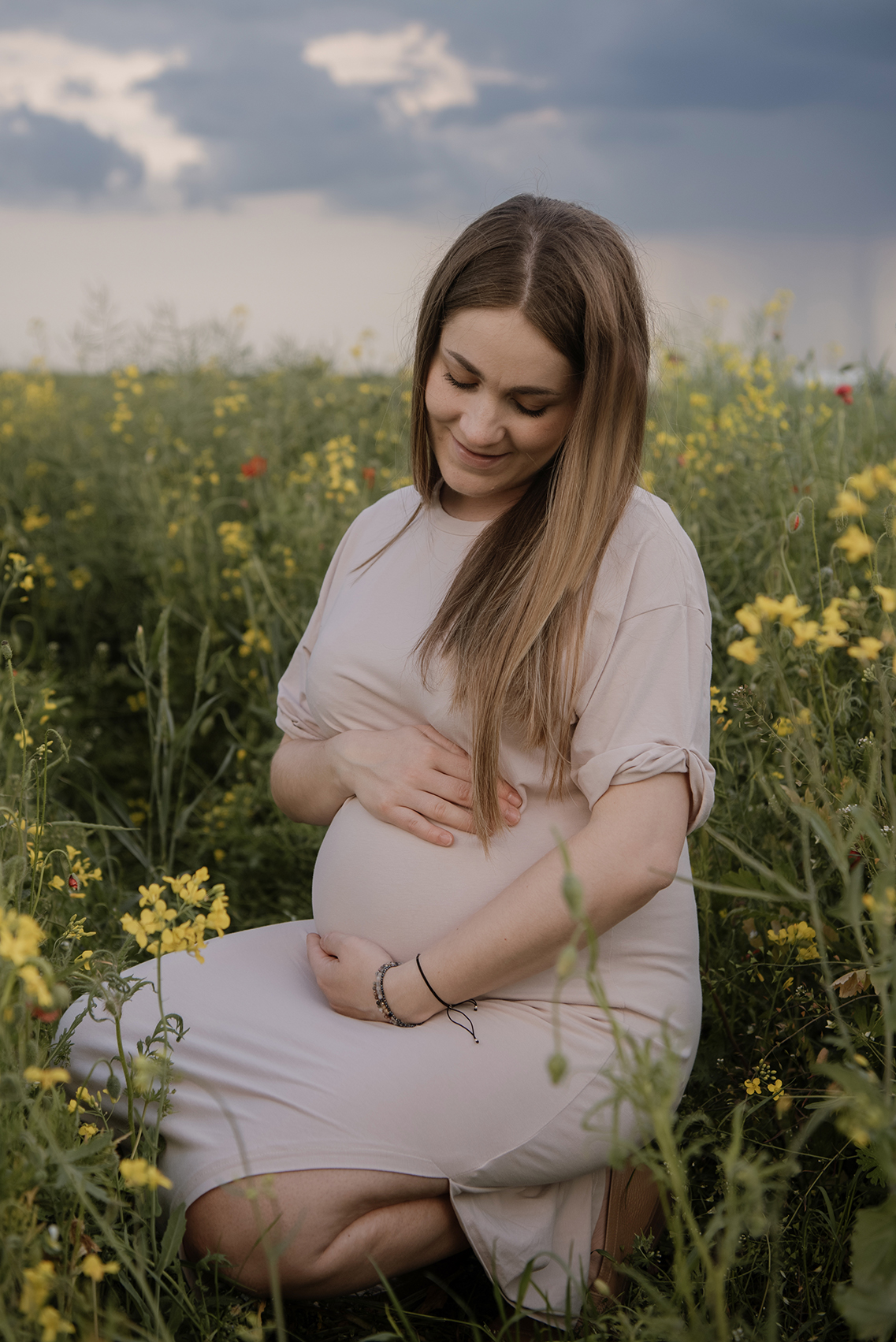 FOTOGRAFIE: OLIWIA HOWANIEC Schwangerschaft fotoschooting unter stürmischem Himmel zwischen Mohnblumen und Kornblumen > _____ > MAY2025 KONTAKT